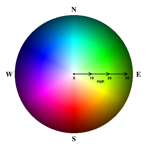 Darkest colors indicate a wind speed above 33 miles per hour (15 m/s).